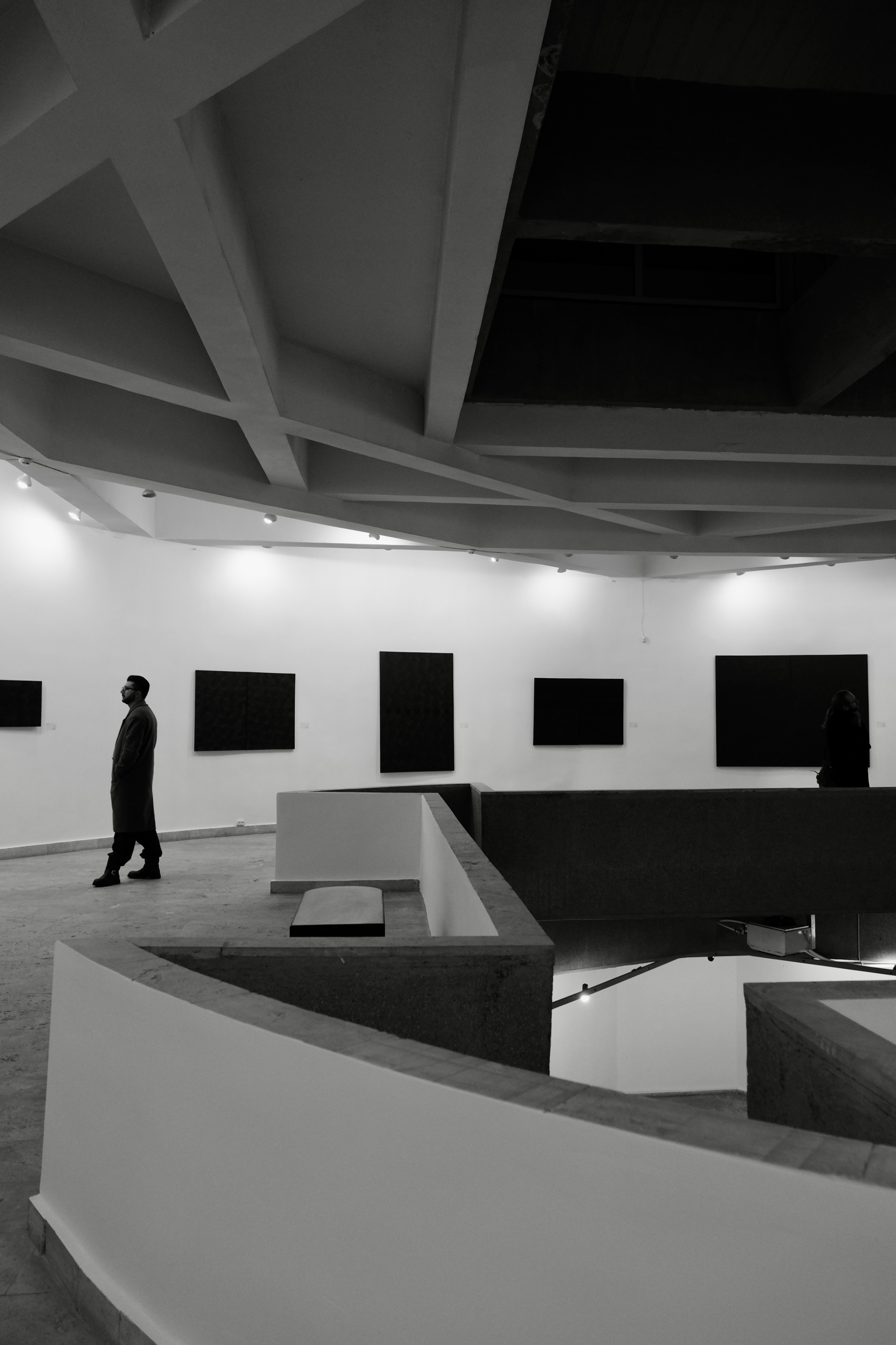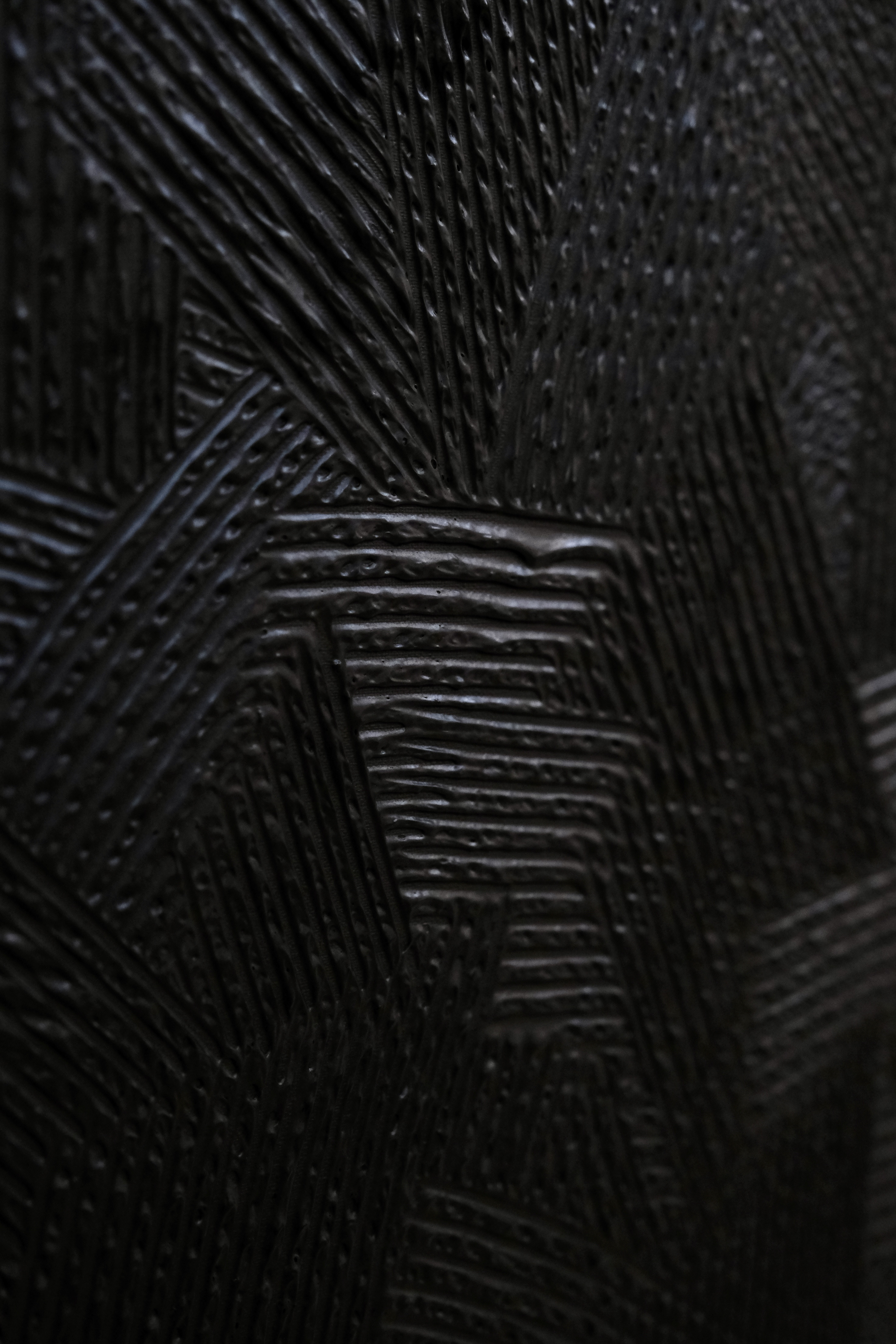 KK: If these paintings were in carbon black you would see nothing from a distance, you’d need to get closer to see the shape of what is on the surface of the painting. Because the carbon black paint absorbs 99.6% of light. And the light defines the expressions on the surface of his painting.