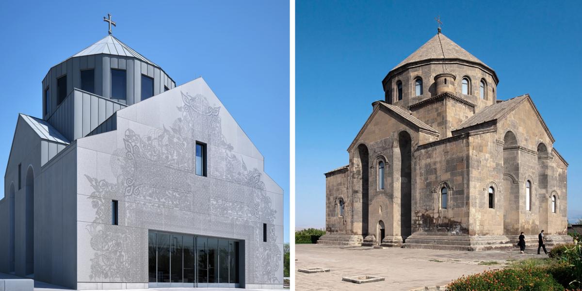 The form of the church is inspired by the 7th-century Saint Hripsime Church in Ejmiatsin and and memorializes the genocide in an image of the Armenian “tree of life” composed of exactly 1.5 million circular icons.