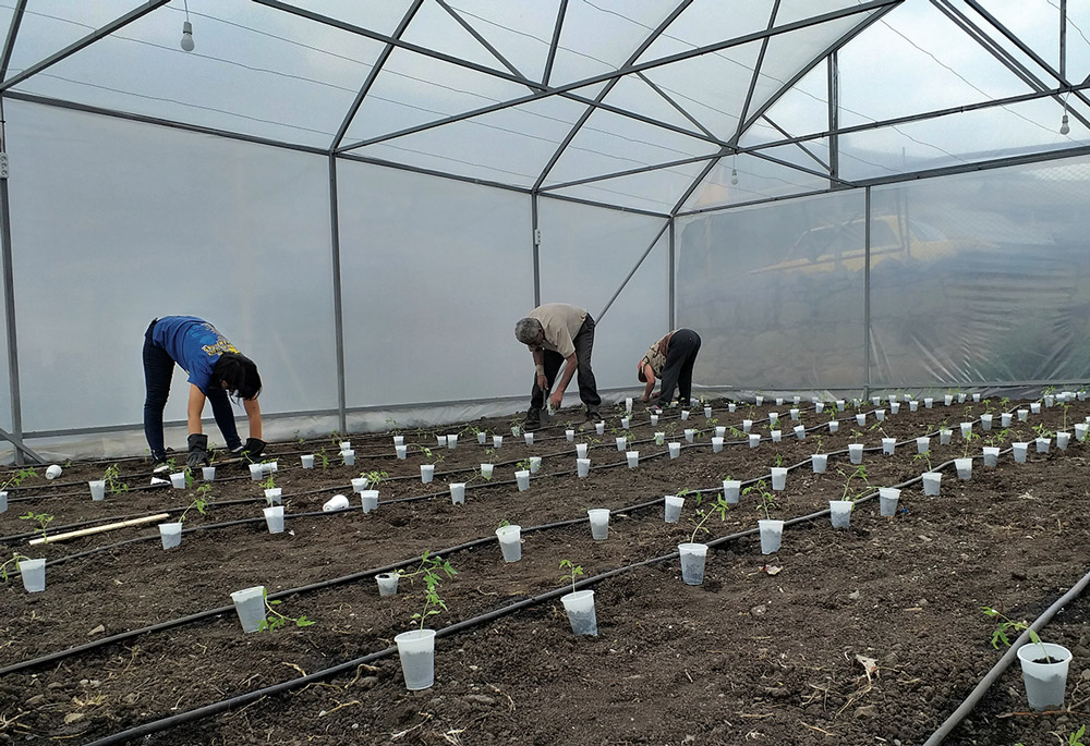 Beneficiaries of the Harvest House CSO working at the greenhouse