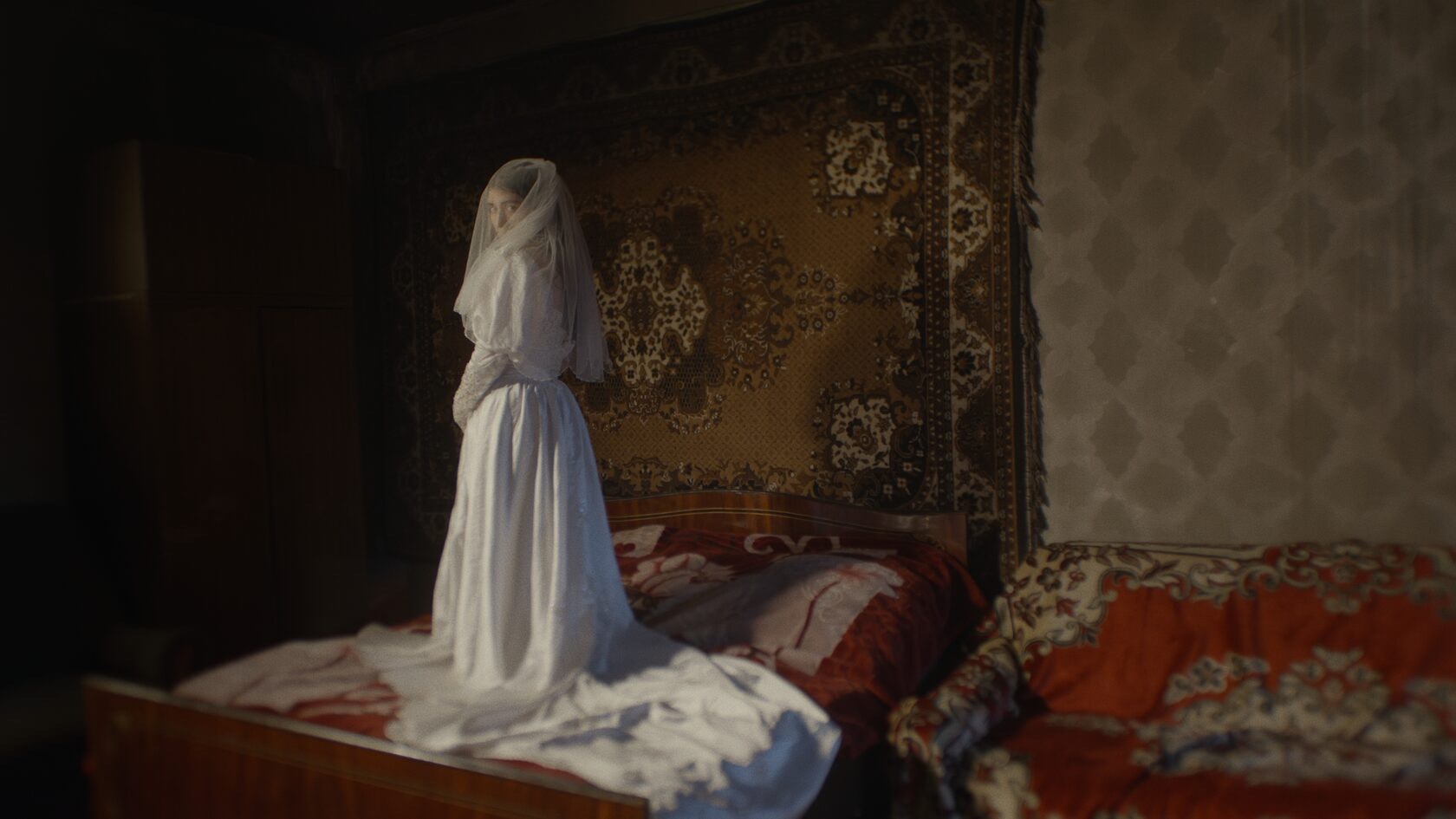Wedding scenes are marked by restraint rather than celebration: formal poses, fixed smiles, and carefully staged gestures dominate the frame. Visual contrasts further complicate the temporal setting: modern tattoos on grooms coexist with hairstyles and costumes reminiscent of 1990s kitsch. This visual ambiguity suggests an Armenia that exists outside a specific historical moment, a space where certain social patterns repeat and remain unresolved.