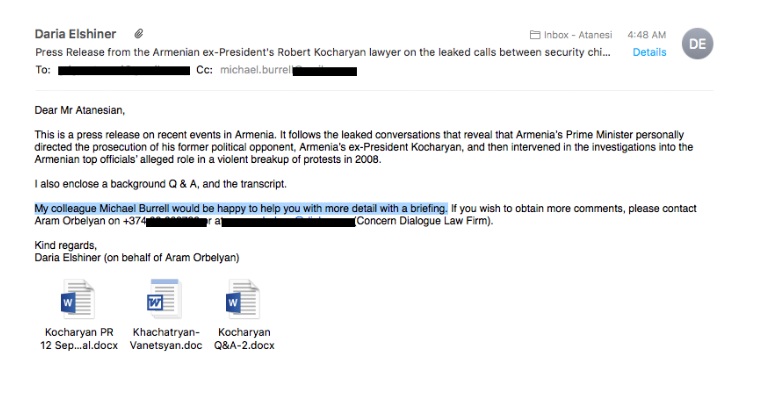 Both articles written by Burrell did not mention any link between him and Kocharyan. Investigative journalist Grigor Atanesyan published letter’s received from Burrell assistant confirming the lobbyist’s cooperation with Kocharyan’s attorney Aram Ohanyan.