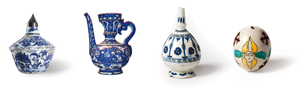 Through centuries Armenian potters crafted a variety of ceramic ware for various uses, some of which are signed pieces with ligatured monograms or signatures in Armenian, revealing the names of Armenian potters, such as the objects crafted by Abraham Vardapet. Other objects and tiles, bearing inscriptions display the names of donors, churches, family members, and the dates.
