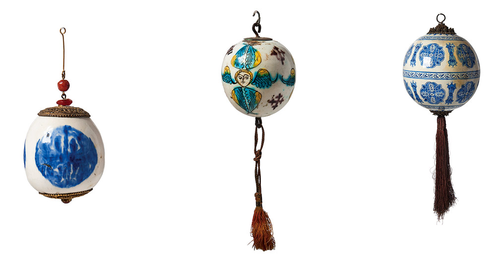Throughout the centuries, Armenian potters pioneered a tradition of provincial and naïve decorative style in the form of pictorial scenes and fancy, colorful figures from daily life and religious themes in the various vessels produced for domestic ware and objects crafted for places of worship. Potters used a siliceous clay with monochrome and polychrome underpainting and a transparent glaze. Egg-shaped or spherical hangings of different sizes were among the most popular ceramic forms to originate from Kutahya. These pottery pendants decorated mostly with polychrome six-winged seraphim and crosses were pierced at either end and hung on chains from oil lamps suspended in churches and mosques, as barriers against mice, or without oil lamps for decorative purposes. Some hangings bear inscriptions with the donor’s name and its destination, which state that they were brought by Armenian pilgrims to Jerusalem as votive offerings for the church.