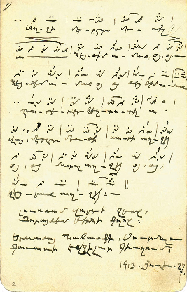Thanks to Limonjian’s system, almost everything was possible with a few tools. Musicologists traveled village by village, having only blank sheets of paper, and transcribed each melody that they found. Komitas was one of these people. It was only in 1917 when Spiridon Melikyan, a student of Komitas, started recording music with a phonograph.