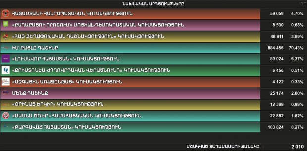 Other parties and alliancies, including former rulling Republican Party and Armenian Revolutionary Federation ("Dashnaktsutyun") didn't reach the point of 5%, needed to be pass into the Parliament. Overall, 11 parties and alliances were competing to have parliament seats.