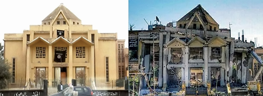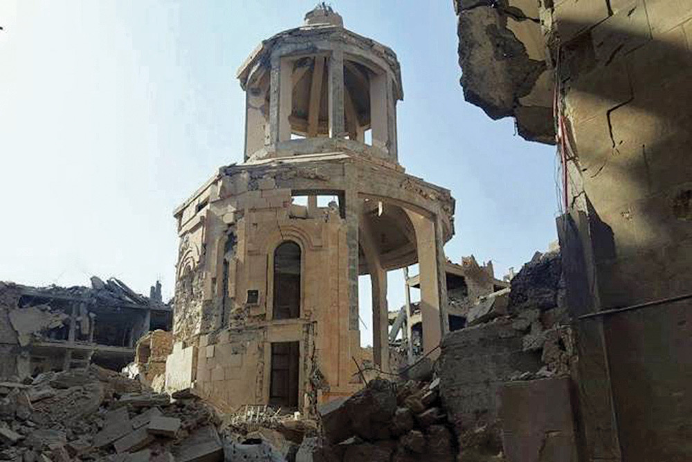 Probably the most iconic example is the Armenian Catholic Church of the Holy Martyrs which is located right in the centre, in what was the capital of the Islamic State. When IS took over the city, the church was converted into a headquarters of the religious morality police, known as the Hisba; later it became a military HQ. During the 2017 Battle of Raqqa, when Kurdish-led SDF forces took the city, the structure was completely destroyed, rendering it almost beyond recognition. In late 2017, the Syrian Democratic Forces de-mined the church and its surroundings.