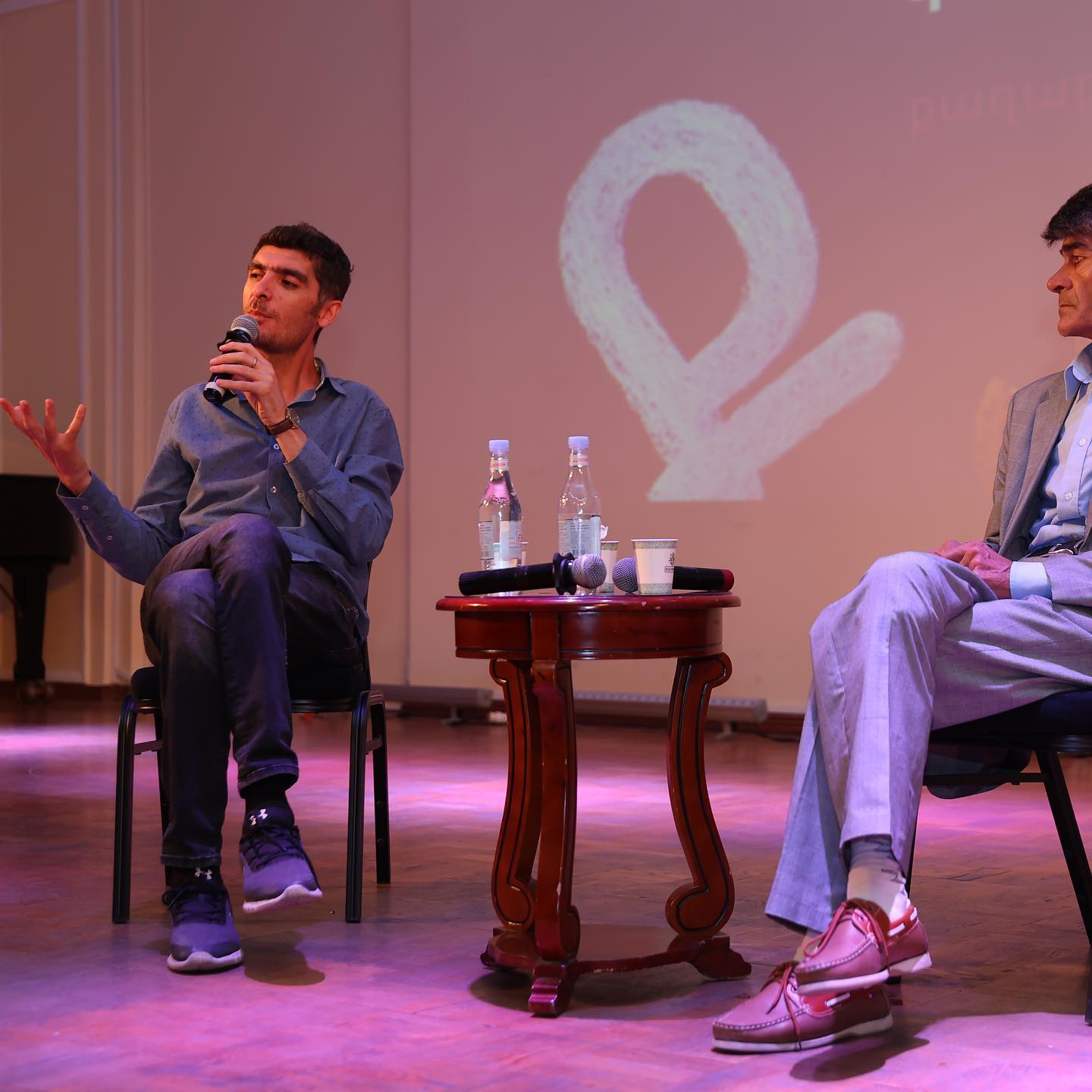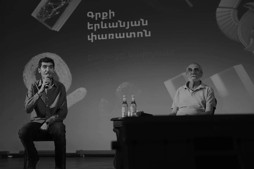 Аркменик Никогосян и поэт Усик Ара Аркменик Никогосян и прозаик Гурген Ханджян на Ереванском международном книжном фестивале