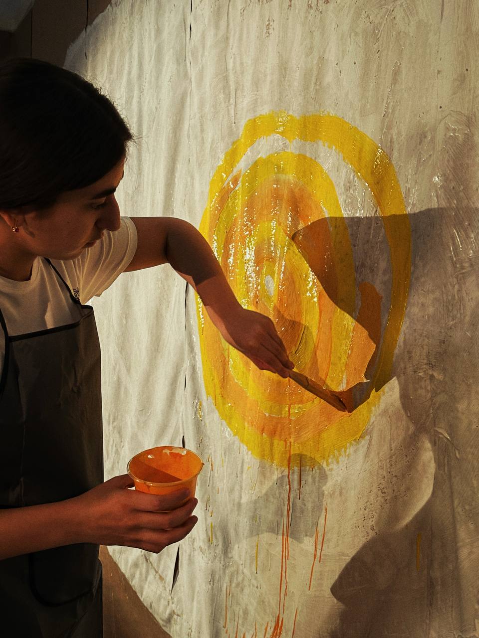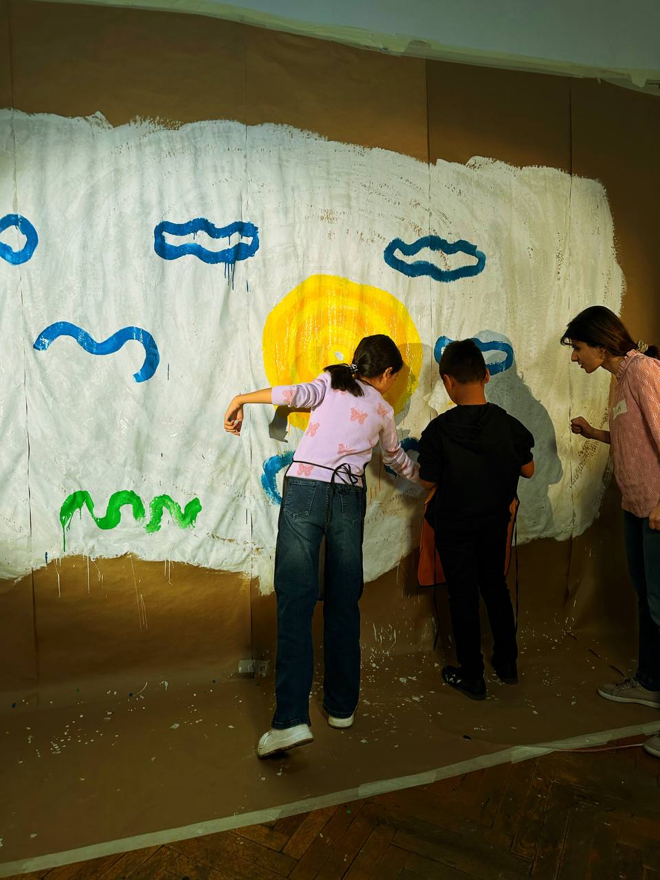 Сначала мы пробовали рисовать на обычной бумаге, но это было не так уж интересно, и Юра предложил: «Давайте возьмём что-нибудь масштабное». Мы повесили на стену листы крафтовой бумаги огромного формата. Юра нарисовал большой кружок – солнышко, и дальше дети могли рисовать абсолютно всё, что хотели.