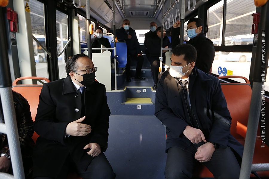 Чрезвычайный и полномочный посол КНР Фан Йонг и мэр Еревана Грачья Саргсян осматривают автобусы китайского производства. Декабрь 2021 года. Фото: yerevan.am.