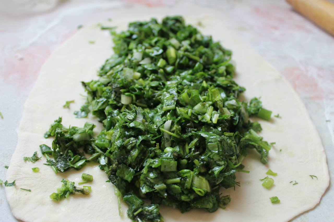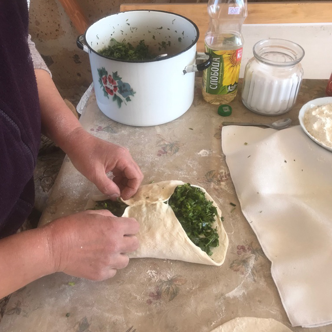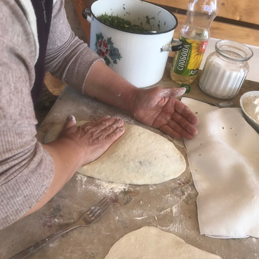 Кармен достает первый шарик из теста, а значит уже можно выпить первый тост. На тонко раскатанный лист теста кладется начинка из зелени и с этого момента в ход идет мелкая моторика пальцев. Закутав зелень в тесто, Кармен переворачивает лепешку и руками придает ей нужную форму, а потом проходится вилкой по всей лепешке, чтобы из нее ушел весь воздух. И вот, наконец, «женгял» можно класть на садж.